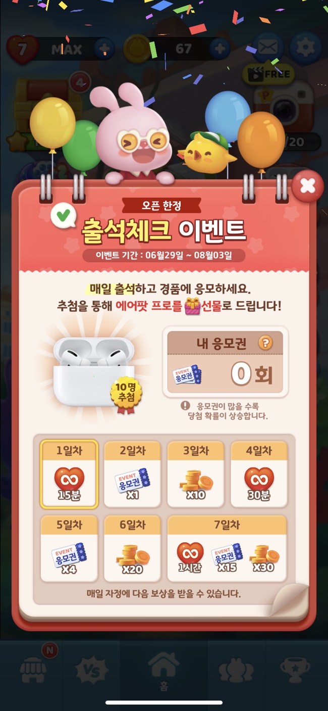 7일동안 출석을 하게 되면 다양한 상품을 받을 수 있는 이벤트 응모권을 줍니다.