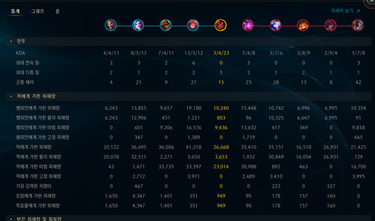 게임 결과에 따라서 그래프와 수치를 통해서 통계를 보여주기 때문에 자신의 장단점 분석, 팀원들의 데이터 분석도 가능합니다.